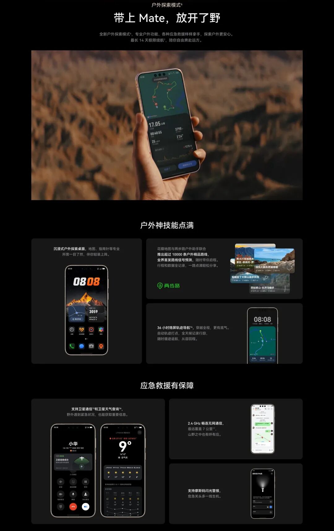 Mate80 Pro Max还行业首发「全金属架构增强天线技术」、「无网应急通信」根本不存在信号不好的情况;还有户外探索模式,在这个模式下能熄屏轨迹导航长达36小时,不得不说真的安全感满满!